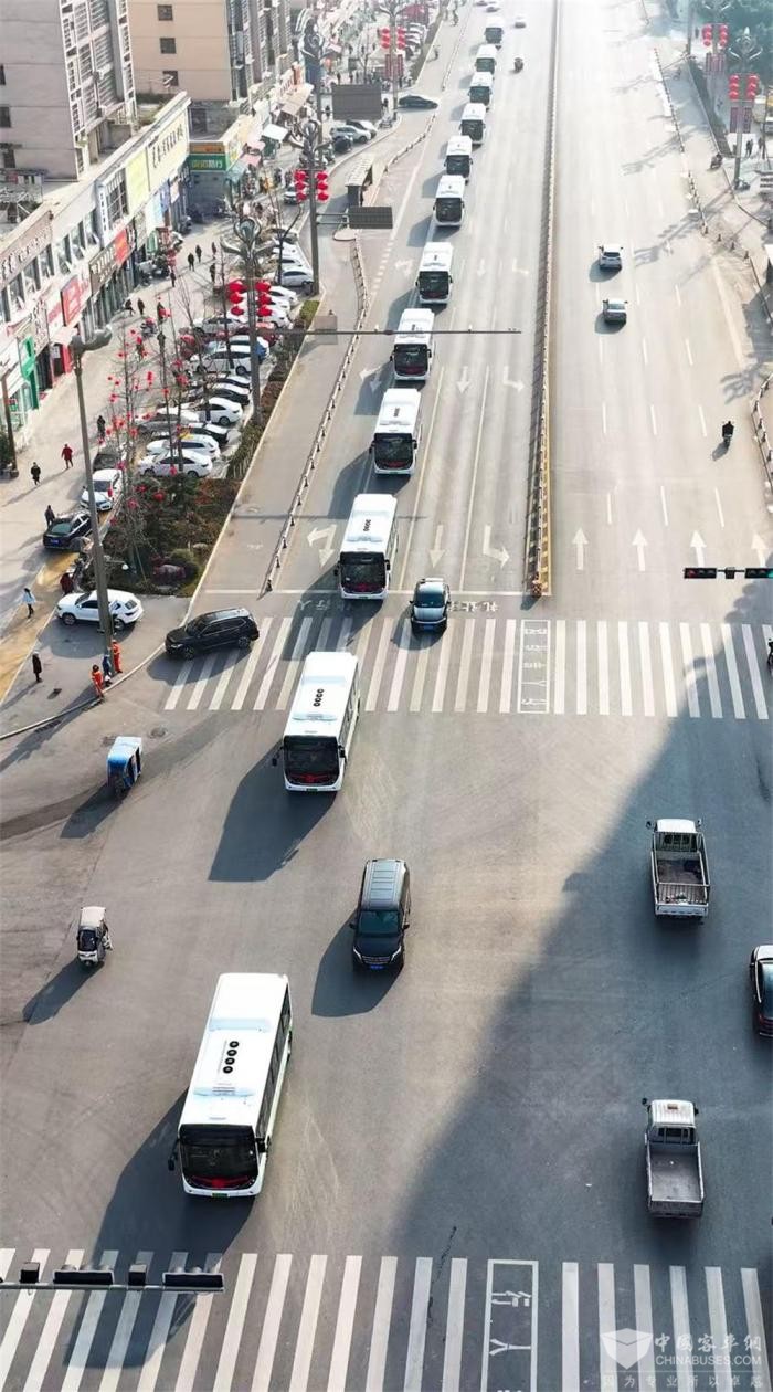 仪式现场,首批13辆崭新的新能源公交车整齐地排列着,车头系着鲜艳的红丝带,营造出浓厚的喜庆氛围。