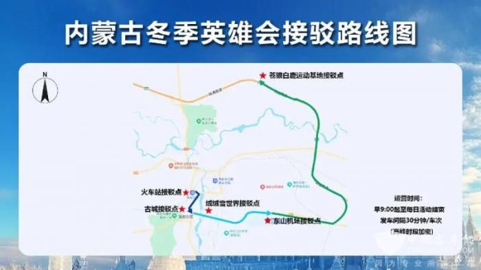 接驳车走闭合循环路线,起点设在海拉尔火车站北侧停车场,沿途停靠呼伦贝尔古城南门、绒绒雪世界、机场停车场,终点直达冰雪英雄会会场,逛完一圈又能坐原车返回,不用来回倒车!