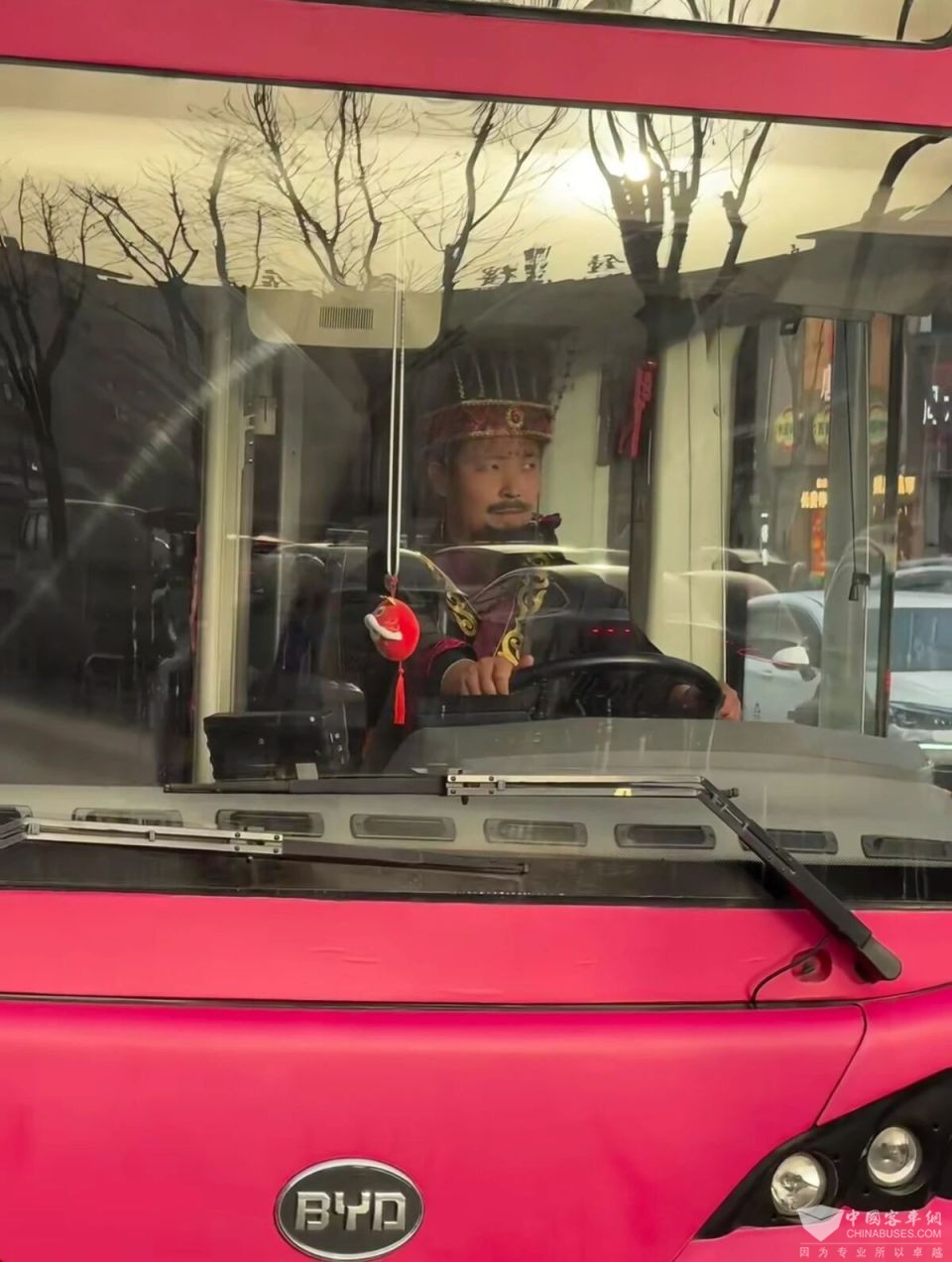 视频显示,在一辆粉色大巴车上,司机师傅身穿古装,头戴冕旒,等待乘客上车的同时,还时不时瞥向一方观察路况。
