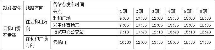 据介绍,云梯山赏花专线为定班次发班模式,日均6班。其中,利和广场发车时段为9:00—16:30、云梯山发车时段为10:30—17:30,市民游客可提前前往指定站点候车。