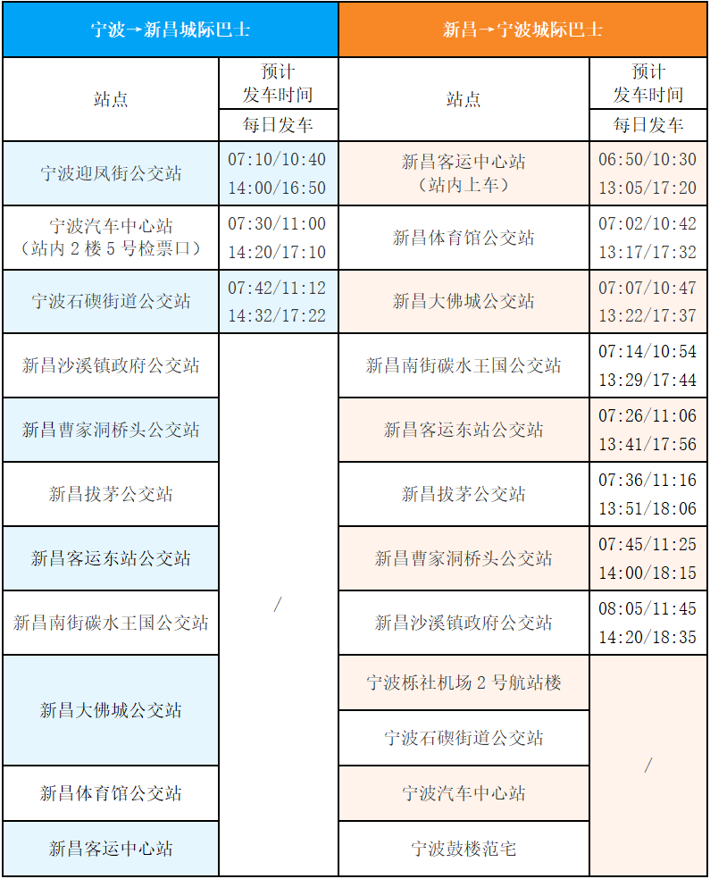 宁波⇌新昌“城际巴士”初期每天往返各4班,乘客可以像坐公交车一样,方便快捷地往返两地。