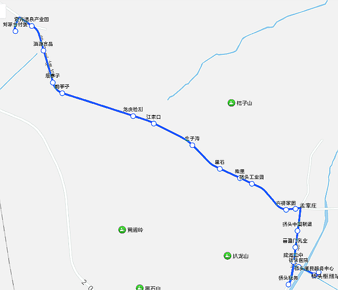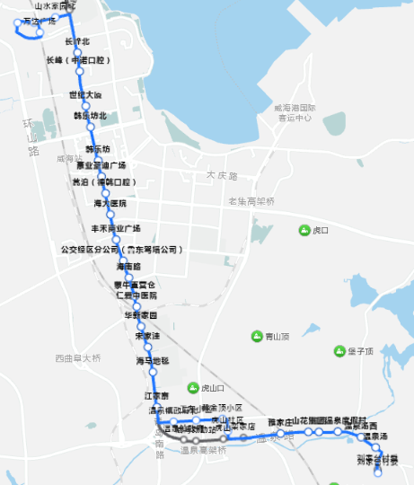 站点设置:望岛集团、望岛小学、万达广场、山水家园北、望岛【刘家台发车不停靠】、长峰北、长峰(中诺口腔)、世纪大厦、韩乐坊北、韩乐坊、豪业圣迪广场、蒿泊(德韩口腔)、海大医院、丰禾商业广场、公交经区分公司(鲁东驾培公司)、海南路、蒙牛直营仓、仁爱中医院、华新家园、宋家洼、海马地毯、江家寨、江家寨立交桥【刘家台发车不停靠】、温泉镇政府北、工友小区、黄金顶小区、虎山社区、雅家庄、山花集团、河西、海源温泉度假村、温泉汤西、温泉汤、刘家台村委。