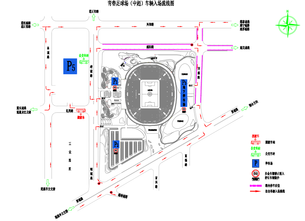 P2停车场:位于靖城路足球场西门南侧,为媒体、工作人员停车区(须持通行证进入)。