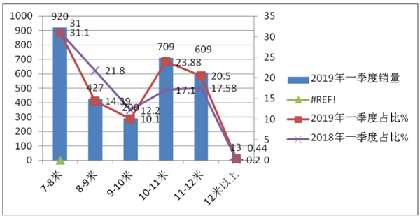 特点一、7-8米是销量最大的长度段,其次是10-11米,再次是11-12米;同比权重增加最大的是10-11米;权重同比下降最大的是8-9米