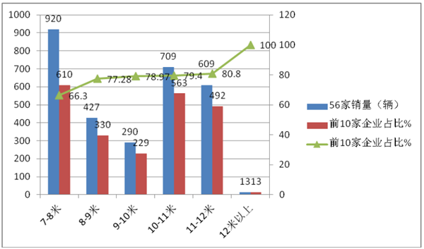 前10家客车企业在山东市场的垄断成都为74.37%。分车型看,7-8米最低,特大型最高,而且垄断程度随车型长度增大而逐渐增强。