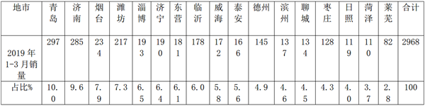 根据最新上牌信息统计,2019年1-3月山东市场大中客销量结构表