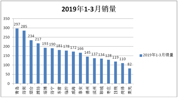 山东十七个地市中,1-3月大中型客车销量是不平衡的。最高的是青岛市,销量达到297辆,最低的是莱芜市只有82辆,销量前3名依次是青岛、济南和烟台,共计销售816辆,占据27.5%,这可能与该地市的经济发展状况和购买能力有直接的关系。很显然,青岛、济南和烟台都是山东经济最发达、购买能力最强的地市,因此,上述三个地级市1-3月大中型客车销量在山东区域最多完全符合客车市场规律。