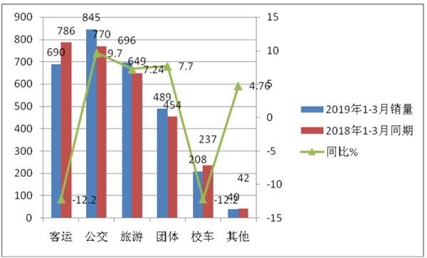2、与2018年同比,公交客车市场增幅最大,这与国家补贴政策和山东本地政策导向有关,旅游与团体客车同比均增长;而客运、校车市场同比均出现超过10%的下降态势。