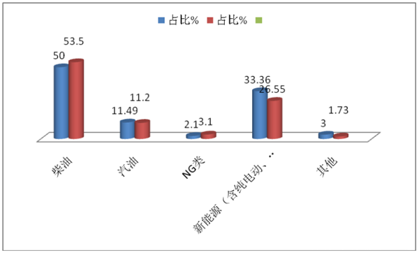 3、汽油客车占据了第三大市场比例,而且同比有下降趋势(同比提高了0.29个百分点)。