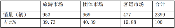 特征一:旅游客车市场与团体客车市场占比几乎势均力敌,客运市场处于弱势