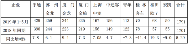 从上表可见,在广东区域2019年前5月大中型公路客车市场中: