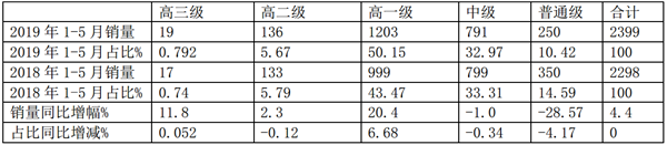 4、中级基本变化不大,普通级同比销量下降28.57%,权重减少4.17个百分点,是下降幅度最大的。