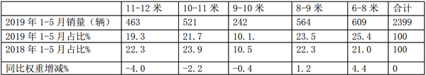 根据数据统计,2019年前5月,按长度段划分,广东区域公路客车市场销量结构如下: