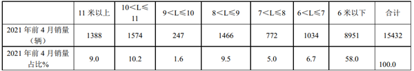 根据终端上牌数据,按长度段划分,2021年前4月江苏区域客车销量结构统计: