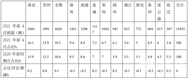 上表数据表明,2021年前4月江苏地区大中轻客车在各区域的分布特点: