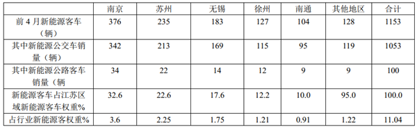 根据上牌信息,2021年前4月,江苏区域新能源客车销量1153辆(行业前4月新能源客车终端上牌销量为10444辆),占据全国超1成的权重: