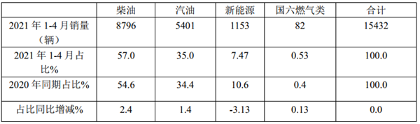 根据最新上牌信息统计,2021年1-4月江苏市场按照燃料种类划分,大中轻客销量结构:
