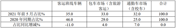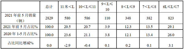 上表显示,在2021年前5月广东区域公路客车市场销量结构中: