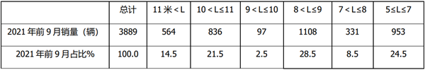 上表显示,在2021年前三季度广东区域新能源客车销量结构中,8-9米销量达到1108辆,占比28.5%,也是唯一销量超过1000辆的细分车型,为最大;其次是5-7米(不包括电动轻客物流车)销量为953辆,占比为24.5%,可见广东区域的城乡新能源客车需求占比较高;再次是10-11米,销量为836辆,占比为21.5%;第四是大于11米以上的大型客车,销量为564辆,占比为14.5%。
