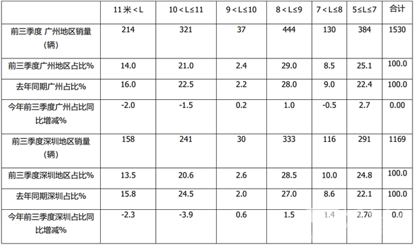 根据上文数据分析,广州和深圳是广东区域的主要新能源客车市场,那么这两个地区主要需求的是重点车型是什么?根据终端上牌信息,进一步研究分析可知,今年前三季度中,广州和深圳地区终端实际销售的新能源客车车型统计如下表(数据来源:终端上牌信息):
