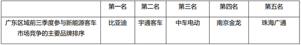 上表排序可知,在今年前三季度广东区域的新能源客车市场竞争中,比亚迪位居第一(占据地利优势)、宇通第二(实力第一),中车电动居第三,南京金龙排第四,珠海广通列第五(地利优势)。