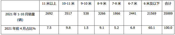 根据终端上牌数据,按长度段划分,2021年前10月江苏区域客车销量结构统计: