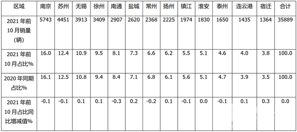 上表数据表明,2021年前10月江苏地区大中轻客车在各区域的分布特点: