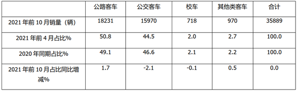 上表可见,在2021年前10月按目标市场用途划分,江苏区域的公路客车市场占比50.8%,为最大,且同比增加1.7个百分点;其次是公交客车占比为44.5%,占比同比减少2.1个百分点,同比减少幅度最大;校车占比为最小,且占比同比减少0.1%;其他客车(主要是指救护车及运送疫苗等专用客车)占比为2.7%,占比同比增加0.5个百分点。此分析给车企在制定市场策略上如何分布产品资源提供一定的量化依据。