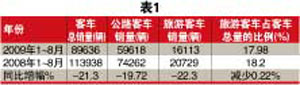 1.旅游客车随公路客车市场的下降而下降,但下降的幅度比公路客车要大,旅游客车占客车市场总销量的比例同比有小幅下降。2009年1~8月共销售客车89636辆,其中公路客车是59618辆,座位客车是57981辆,卧铺客车是1637辆。按目标市场的用途来划分,用于城乡和城际客运的是43505辆,用于旅游客运的是16113辆。可见,在公路客车市场中,用于城乡和城际客运与旅游客运的比例接近2.7:1;旅游客车占客车总销量的比例为17.98%。从2008年7月1日国II转国III以来,特别是2009年以来,金融危机使得公路客车市场持续低迷,导致2009年1~8月以来比去年同期降低了19.72%(去年同期共销售客车113938辆,公路客车的销售数量为74262辆,用于城乡和城际客运53533辆,旅游客车数量为20729辆,旅游客车占客车总销量的比例为18.2%),具体见表1。