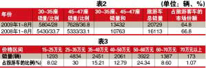 4.按价格来细分旅游客车市场,25~35万元区间的旅游客车销量最大,其次是50~60万元区间的产品。这是因为这两价格区间的旅游客车性价比较高,投资回报率比较高。2009年1~8月15~25万元、25~35万元、35~40万元、40~50万元、50~60万元、以及70万元以上区间的旅游车销量统计如表3。