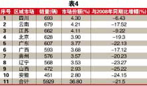 6、下降幅度最大是内陆省份山西,下降幅度达到25.22%,次大的安徽区域达到24.15%,第三大的是东北区域辽宁,达到23.27%,前10名区域的市场份额与2008年同期比整体下降了21.5%。