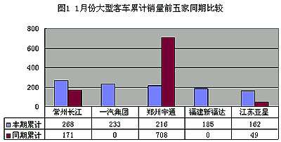 1月份由于春节假期的缘故,汽车产销均出现下滑。1月全国汽车产销分别为29.97万辆和30.41万辆,同比分别下降9.68%和7.34%。其中客车产销分别为8.09万辆和8.49万辆,同比分别下降15.72%和19.23%。 2004年1月份与03年12月份相比,客车总产量减少38424辆,下降幅度达32.21%。大、中、轻、微客车环比全部出现下降。1月份大型客车产量为1432辆,中型客车产量为2824辆,与12月份相比大型客车和中型客车下降绝对数较少,但由于基数较小,下降幅度却分别达到50.60%和53.86%,1月份轻型客车产量为28425辆,比12月份下降36.62%。微型客车产量为48187辆,比12月份下降26.34%。 2004年1月份客车共销售12.72万辆,比03年12月份下降33.17%。与生产相同,各型客车销售都出现下降,其中与12月份相比销售下降幅度最大的为中型客车,共销售2908辆,下降54.28%。大型客车降幅排在第二位,共销售1582辆,比12月份下降50.08%。排在三、四位的依次是轻型客车和微型客车,分别销售26244辆和54257辆,分别下降42.19%和24.90%。 1月大型客车生产企业累计产量前五家企业是常州长江、一汽集团、福建新福达、郑州宇通、江苏亚星,前五家企业的产量占整个行业比例达到了68.02%。销售前五家企业分别是常州长江、一汽集团、郑州宇通、福建新福达和江苏亚星。其销量和占整个行业的67.26%。值得注意的是一汽集团产销排名都上升到第二位。 1月中型客车累计生产量前五家的企业为:安徽江淮、一汽集团、苏州金龙、东风汽车、亚星客车,其五家企业的生产集中度达到70.68%,从累计销售前五家企业为安徽江淮、苏州金龙、一汽集团、东风汽车和郑州宇通,其中郑州宇通和苏州金龙当月产销率分别达到152.04%和112.29%,而一汽集团产销率只有66.47%。 1月轻型客车累计产量前五家的企业是华晨金杯、浙江豪情、安徽江淮、东南汽车和长城汽车。华晨金杯继续位居第一,但同比累计却下降28.79%;本期累计销售同比也下降26.59%,而安徽江淮产销同比均出现大幅上升,上升幅度分别达到74.61%和25.05%,安徽江淮推出的瑞风MPV市场表现强劲,为江淮销量上升贡献不小。 1月微型客车生产企业前三家为:哈飞、上汽通用五菱和长安。三家的产量集中度占整个行业的74.77%,三家的销量集中度更达到76.60%。