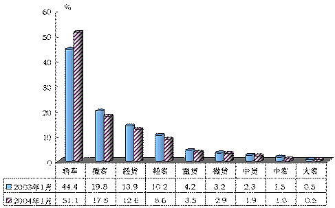 2004年1月九大类车型市份额对比 轿车市场继续扩张,占据国内汽车市场的半壁江山,同比增长6.7个百分点;大客市场没有变化,其它车型市场均不同程度收缩