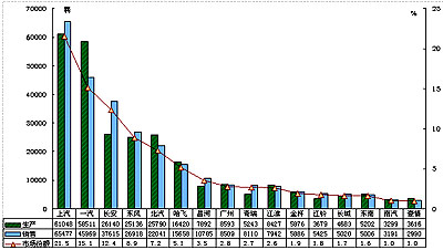 2004年1月主要汽车企业产销量及市场份额排序 (本图中各企业均指汽车集团)