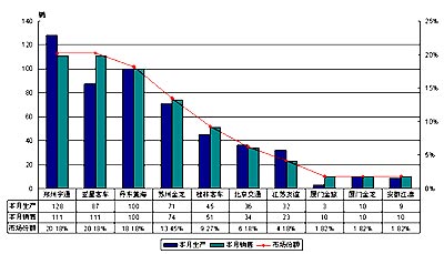9-10米客车本月销量所占总销量8.57%,同去年12月8.96%相比基本无变化。本月这一区段销量为550,由于假期影响销量不大。表集中10家客车企业的销量所占本系列总销97.09%。丹东黄海以100台的销量将苏州金龙挤出前三名,北京交通首次进入前十位。