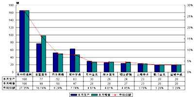 10-11米客车本月销量所占总销量9.46%,比去年12月增加0.81%,本月这一区段客车总销量达到607辆。下表10家客车企业中所占本区段总销量达到83.53%,在这一区段中公交车生产企业一直名列前位,本月常州依维柯以27.35%的市场份额排在首位,相比亚星客车销量多了近70辆。