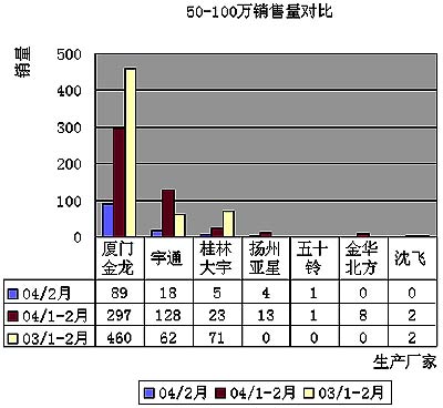04年2月份统计到高档客车销量主要有以上几家企业。由于03年春节是在2月份, 1月份仍然是购车旺季,故各厂家03年1-2月份较04年1-2月份销量多。广州五十铃04年2月份销售17辆,销量排在首位。