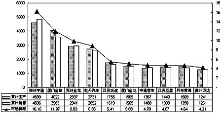 表一:2004年1-4月份客车企业累计总销量前十名企业总产销量及市场份额