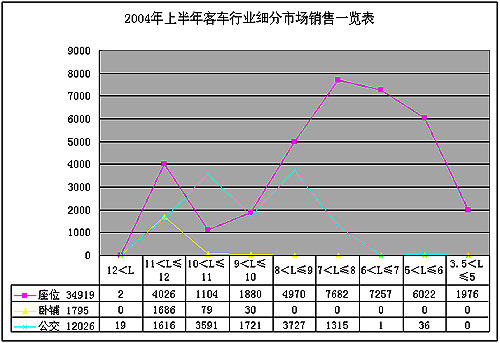 2004年上半年,主流客车企业积极介入公交产品的生产,并且在销售政策等方面进行倾斜,主要原因在于公交市场消费环境好转,全额付款、车辆档次提升使得客车厂家生产公交产品的附加值提高;国家经济发展以及城市规模经济发展带动了公交市场的具大需求。