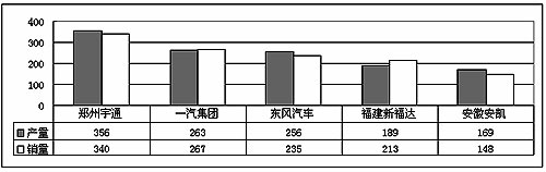 6月份大型客车的本月产量是2231辆,比5月份增长18.36%;本月销量是2179辆,比5月份增长15.54%,大型客车企业市场继续保持高增长。6月份大型客车生产企业产量排名前五家企业依次是郑州宇通、一汽集团、东风汽车、福建新福达和安徽安凯。