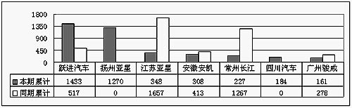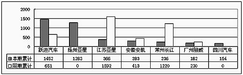 注:其他企业累计销量为重庆力帆(142)、桂林客车(91)、河北长安(88)、成都隆鑫(86)、成都汽车(38)、上海汇众(36)、金华北方(35)、浙江飞碟(16)、湖南三湘(11)、广州五十铃(6)、镇江汽车(5)、北方华德尼奥普兰(2)、沈飞客车(2)、郑州轻型(1)、广州羊城(0)、辽宁黄海(0)、辽宁鸿凌(0)、重庆专用(0)。
