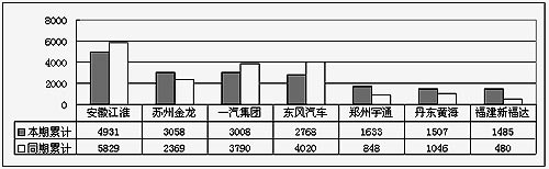 1~6月份中型客车生产企业(32家)累计产量排名前五家的企业分别是安徽江淮、苏州金龙、一汽集团、东风汽车和丹东黄海。除苏州金龙为27.8%和丹东黄海为53.19%外,其余三家均出现下降分别是安徽江淮为-15.6%、一汽集团为-36.06%和东风汽车为-34.61%。有八家中型客车生产企业出现增长,其中以跃进汽车(177.18%)、福建新福达(132.05%)、郑州宇通(97.41%)和丹东黄海(53.19%)为代表,并且这四家的累计产量均在千辆以上。同时,还有八家中型客车生产企业去年同期累计产量为零,无法计算累计增长率。此外,剩余16家中型客车生产企业继续负增长。从本月中型客车行业来看,产量已经较上月明显增长,但是,受前期产量影响,本期累计增长率仍为负值。本期中型客车企业累计产量是22656辆,与同期累计相比为-5.84%,中型客车市场格局变化明显。