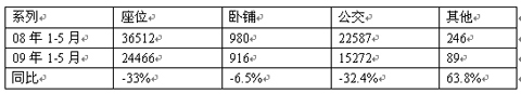 2009年1-5月份,客车行业整体下滑32.5%,其中座位客车下滑33%,公交客车下滑32.4%,这是近年来客车市场下滑最严重的一次,从座位和公交客车的下滑幅度来看,可以说是全系列下滑。