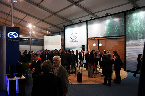 银色钢制立柱上,蓝底白字的大金龙商标图文非常醒目。主展示屏上"CHINA'S BUS AND COACH LEADER"(中国客车领导品牌)的主题,展现出大金龙作为"中国客车专家"的自信。罗剑告诉记者,为了树立中国客车的良好品牌形象,加大在欧洲市场的推广力度,大金龙为此次参展投入重金。500平方米的参展面积和三款展车的规模,一扫两年前首次参展时的局促,彰显出新兴国际客车品牌应有的气势。