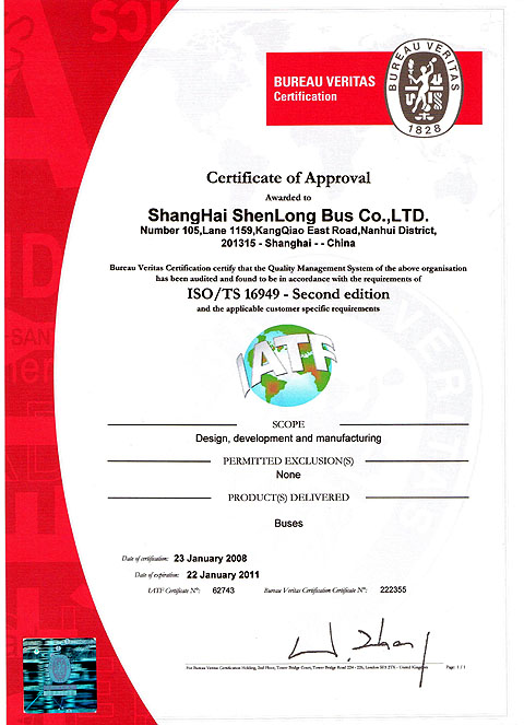 据了解,此次 ISO/TS16949:2002版质量管理体系认证的通过,是申龙继国家强制3C认证、上海名牌、上海客车展获得两项大奖之后获得的又一殊荣,为申龙继续快速成长、创建中国品牌、进入中国客车业第一方阵的目标打下了坚实的基础。