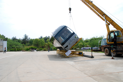 客车落地之后,除了落地一侧玻璃摔碎和前挡风玻璃出现裂纹之外,整车骨架基本没有变形,车内用来模拟人体的泡沫完好,经过专家测量,插入泡沫部分的竹签最长的不到15厘米(竹签最长的为37.5厘米),大大超出安全标准要求。侧翻的结果不言而喻:在场人员欣喜地表情足以说明一切。
