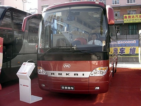 进入2008年,安凯客车的国际化步伐不断加快,出口伊朗的客车已开始执行,出口澳大利亚的HFF613K07D豪华客车顺利通过澳大利亚政府ADR认证,从而拥有了在澳洲市场销售的资格。此次安凯积极参加首届中亚车展,并派出三辆代表性的车型在穿越秦岭、跨越黄土高原、青藏高原、西北戈壁后顺利抵达乌鲁木齐展出,以行动向外商展示其安全与科技。其中12米的下沉式卧铺WK79和8.9米的经济型中型客车KZ-8是首次亮相,它们采用的德国航空科技设计的全承载技术首先保证了客车的安全性。WK79采用了下沉式设计,驾驶区下沉有效的增加了铺位数,同时先进的悬架系统提高了卧铺的舒适性。整车价位适中,市场售价不超过100万,性价比相当高。而KZ-8超大的39座设计和欧三发动机的节油环保显示出其很强的经济适用性。此外,针对西北的特殊路况,WK79和KZ-8通过优化车身结构使其更加适应西部的路况,提高了整车的安全性。它们在整个西部巡展过程中的卓越表现验证了其经济、耐用、安全的特性。