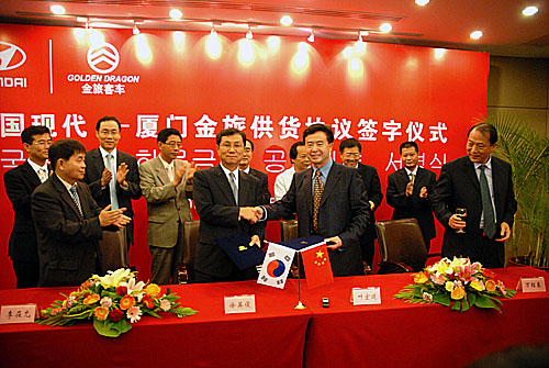 作为全球5大综合汽车集团的现代汽车集团,2007年全球市场的总销售量是399万台,其旗下的现代商用车部门现生产从微型卡车/客车到超大型卡车/客车的全系列商用车车种,拥有甚至可以出口到欧洲/北美/日本等发达国家的自主开发的最新发动机,已经成长为世界屈指可数的商用车企业之一。今年,厦门金旅通过前期的考察与交流,最终与韩国现代自动车株式会社达成客车底盘及动力系统的供货协议,希望在与韩国现代的合作下,力推金旅客车以更快的速度成长为中国市场内的最高级客车。