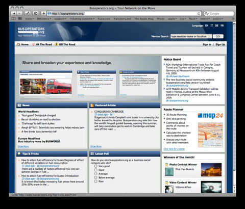 作为该网站的管理人员,Engin Çolak表示:“目前全球经济还面临众多不确定因素,鉴于此,客车运营商们只有通过更加畅通无阻的信息沟通和有效的合作才有可能确保公司业务的健康可持续发展。欧洲客车运营商网上商务社区Busoperators.org将为欧洲客车届的商务人士和运营商提供一条有效而便捷的沟通途径,促进企业之间的互动和合作。同时,也能有效地帮助各个运营商联合行动起来,共同解决面临的困难和挑战,包括欧盟客运相关法律的改变和更加严格的车辆尾气排放标准等等。”
