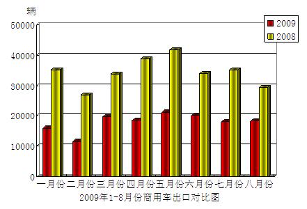 2009年8月份,商用车出口1.84万辆,比上月增长了2.26%,比去年同期下降了37.85%;创汇金额3.51亿美元,比去年同期下降了49.76%。其中:货车产品出口1.51万辆,比上月增长了4.80%, 比去年同期下降了28.33%;创汇金额2.02亿美元,比去年同期下降了40.76%。